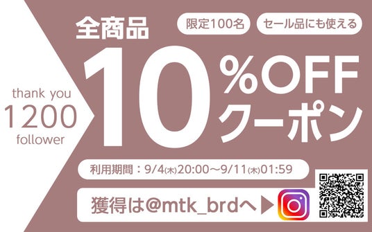 MTKブランド公式Instagram、フォロワー1,200人達成記念 楽天「MTK SHOP」で使えるインスタ限定10%OFFクーポンを配布!