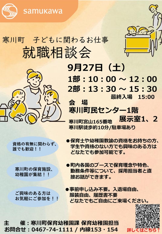 寒川町では町内の保育・幼稚園施設を集めた就職相談会を開催いたします。資格や経験に関係なく、多くの方々にご参加いただける機会ですので、ぜひこのチャンスをお見逃しなく。