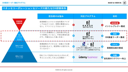 こうした背景を踏まえ、今年度よりベネッセグループに参画したことを契機に、ジーズとベネッセの総力を結集して開発した新体系が『DX推進リーダー養成講座』です。既存事業の変革を担い、現場と経営をつなぐリーダー層にフォーカスした本講座は、「事業創造型DXプログラム」と合わせて展開することで、企業におけるDX人材育成を“創造”と“推進”の両面から支援してまいります。