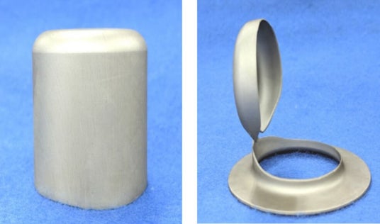 写真1 円筒深絞り試験後の外観(左:SFA仕上、右:一般ナマシ仕上)