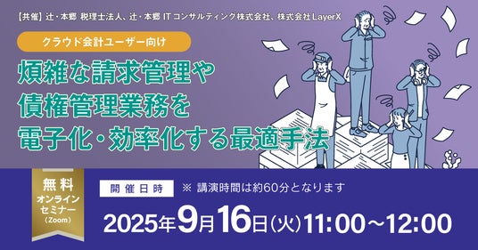 辻・本郷 税理士法人(本社:東京都新宿区、理事長:桑木小恵子)は、辻・本郷 ITコンサルティング株式会社(本社:東京都渋谷区、代表取締役社長:黒仁田健)と、株式会社LayerX(本社:東京都中央区、代表取締役CEO:福島良典)と共催で、2025年9月16日(火)に「【クラウド会計ユーザー向け】煩雑な請求管理や債権管理業務を電子化・効率化する最適手法」セミナーを開催いたします。本セミナーは、クラウド会計導入後の経理ご担当者様へ向けて、煩雑な請求管理・債権管理業務を電子化し、劇的に効率化するための「最適手法」を、導入効果を実感できる事例を交えてご紹介します。現場課題の共有から、実際のシステムデモまで、人的ミスや確認漏れリスク等を減らし業務効率化するノウハウを、専門家が詳しく解説します。