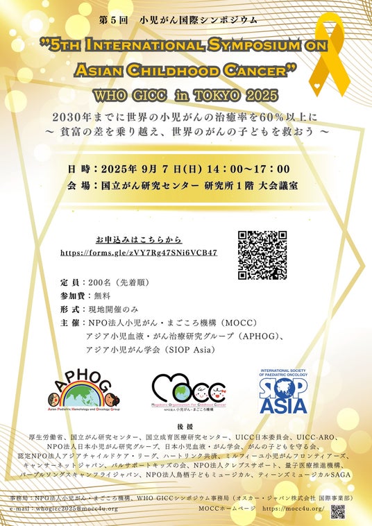 NPO法人小児がん・まごころ機構(代表理事:中川原 章、所在地:東京都中央区、以下MOCC)は、2025年9月7日(日)に国立がん研究センターにて「第5回 小児がん国際シンポジウム WHO GICC in TOKYO 2025」を開催します。本シンポジウムは「2030年までに世界の小児がんの治癒率を60%以上に」をテーマに、国内外の医療者・患者家族・支援者が集い、治療格差を超えるための議論と交流を行います。また、活動資金を支援するクラウドファンディングをREADYFORにて開始いたしました。