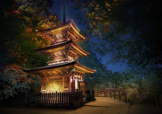 山門、参道、三重塔など寺院を代表する建造物が光で彩られ、秋の紅葉が幻想的に浮かび上がります。