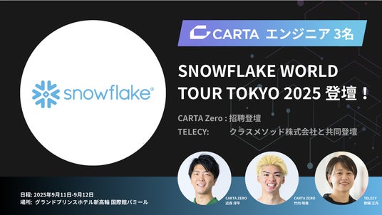 株式会社CARTA HOLDINGS(東京都港区、代表取締役 社長執行役員:宇佐美 進典、東証プライム市場:証券コード3688)は、2025年9月11日(木)・12日(金)の2日間にわたりグランドプリンスホテル新高輪 国際館パミールにて開催されるデータクラウドカンファレンス「SNOWFLAKE WORLD TOUR TOKYO 2025」において、当社グループ会社所属のエンジニア3名が登壇することをお知らせいたします。