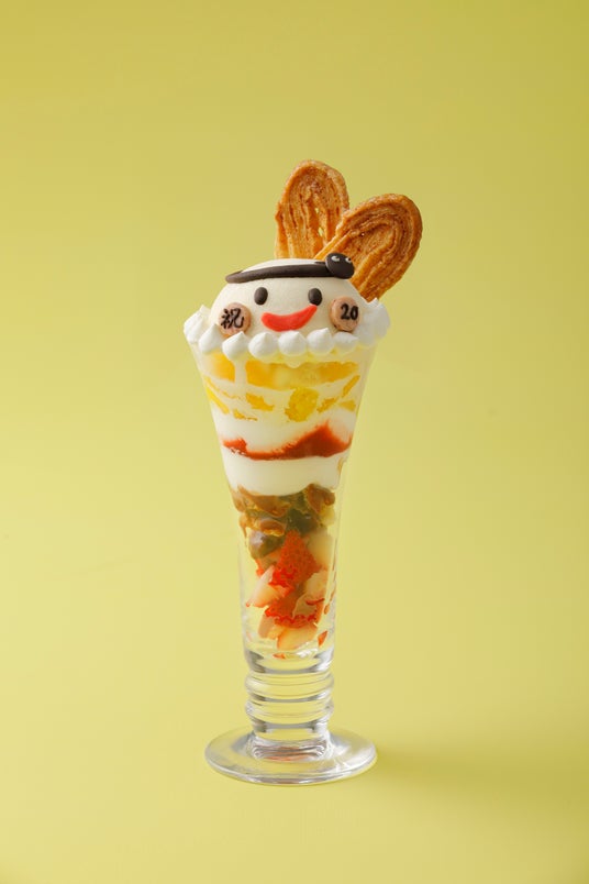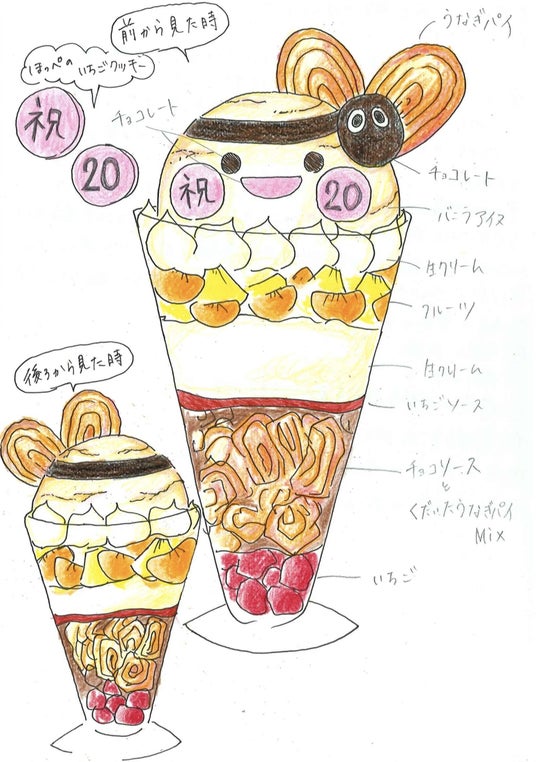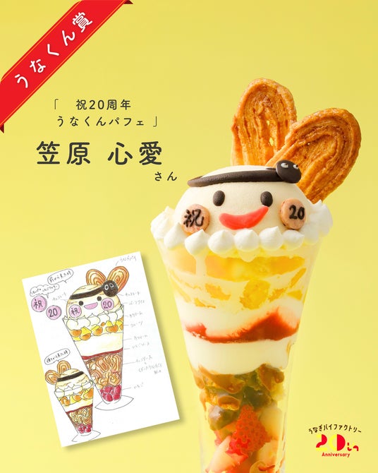 ■考案者名:笠原心愛 さん(山梨県・10代)■パフェのポイント:うなぎパイファクトリーとともに20年歩んできた“うなくん”をテーマに見た人がかわいい!食べたい!と目を引かれるようなデザインにしました。バニラアイスでうなくんの頭を、チョコレートで顔やはちまき(うな左えもん)、うなぎパイでうな左えもんのヒレを表現。ほっぺたの「祝20周年」もポイントです。