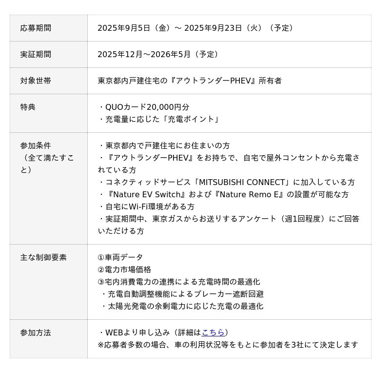 東京ガス株式会社(社長:笹山 晋一、以下「東京ガス」)と三菱自動車工業株式会社(社長:加藤 隆雄、以下「三菱自動車」)、Nature株式会社(CEO:塩出 晴海、以下「Nature」)の3社は、東京都の「家庭の環境アクション推進事業」に採択された*¹電動車の遠隔充電制御実証(以下「本実証」)について、2025年度下期より開始することを合意しました。あわせてモニターの募集を2025年9月5日(金)より開始します。