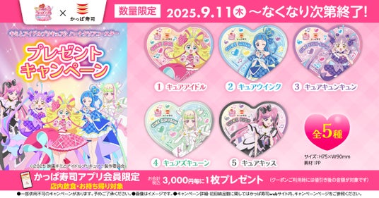 ・内容:期間中、お会計税込3,000円以上ご利用いただき、レジにてかっぱ寿司公式アプリ内の「バーコード付引換券」をご提示いただいたお客様に、かっぱ寿司限定の「キミとアイドルプリキュア♪ ハートクリアコースター」を お会計税込3,000円毎に1枚プレゼントいたします。