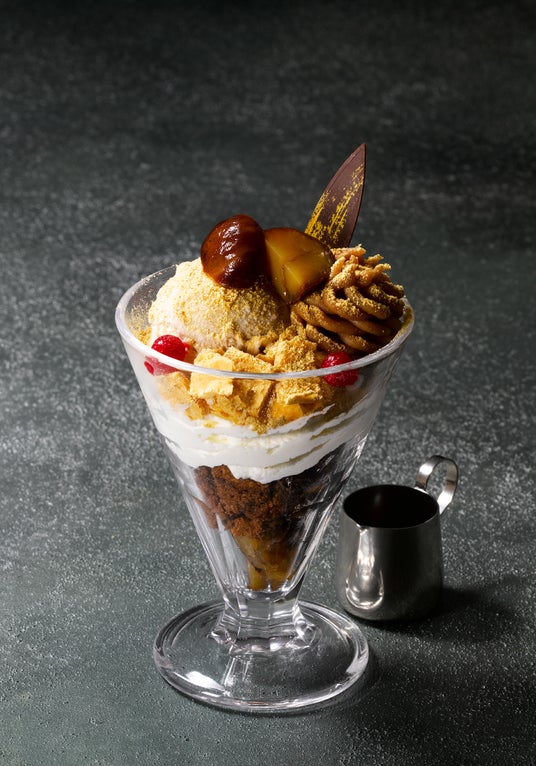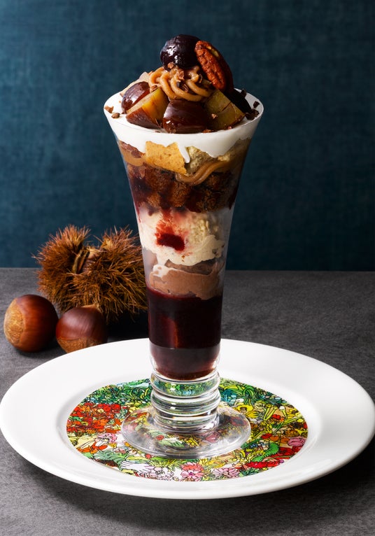 フォレ・ノワール仕立てのマロンパフェ1,880円(税込2,068円)フォレ・ノワールとは「黒い森」という意味のフランス語で、ドイツ南西部の「黒い森」と呼ばれる森林地帯にちなんだ、キルシュを使ったお菓子です。ココアスポンジ、ホイップクリーム、チェリー、チョコレートアイスクリームに渋皮栗、マロンクリーム、渋皮栗のアイス、ピーカンナッツ、グラハムビスケット、仕上げにカカオニブなどを合わせたビターで贅沢な味わいをご堪能ください。
