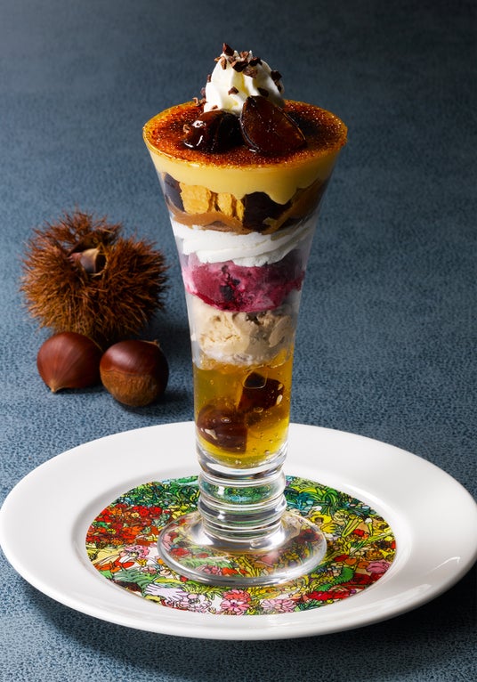 琥珀マロンのブリュレパフェ1,380円(税込1,518円)カリッとキャラメリゼしたクレームブリュレに琥珀マロン(キャラメリゼした栗)をトッピングし、渋皮栗、マロンクリーム、渋皮栗のアイス、パイ、バニラアイスクリーム、カシスアイス、ジャスミンティーゼリーなどを合わせました。濃厚で甘いクレームブリュレから始まり、最後は爽やかで華やかなジャスミンティーゼリーで締めくくる、味わいの移ろいを楽しめるパフェです。