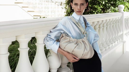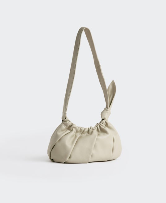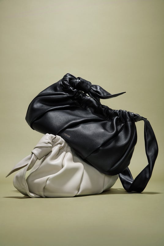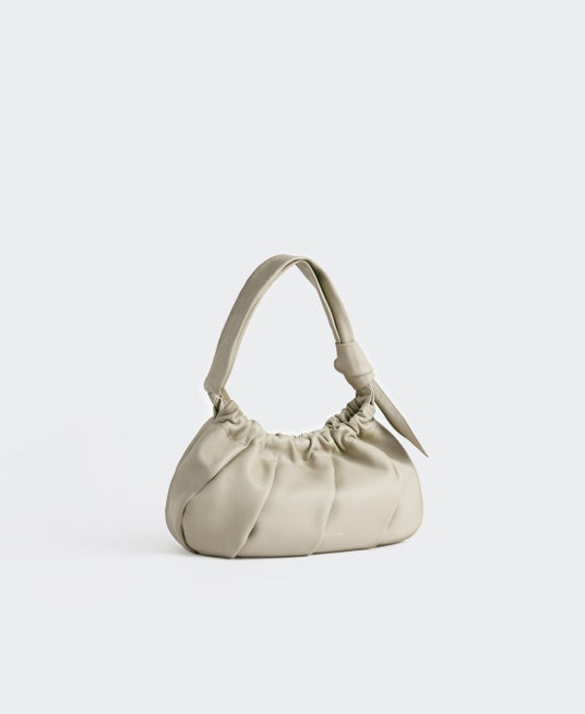 ボリュームのある折り目が特徴的なシルエットを生み出し、カジュアルでありながら洗練された柔らかさを持つデザインが特徴。硬質な金具にとらわれず、柔らかなギャザーとテンションだけで形づくられた独特のフォルム。バターのように柔らかく光沢があるカウナッパレザーの折りたたみが、ユニークで豊かなふくらみを生み出し、自然なドレープを引き立てます。