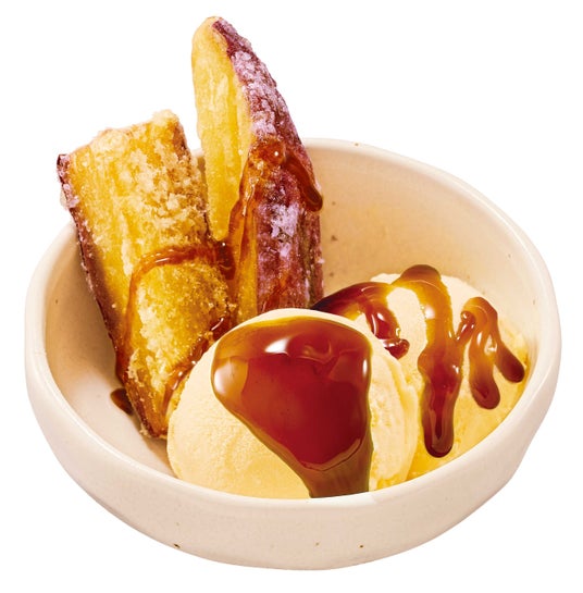 ほっくり甘くねっとりとした食感の揚げ焼き芋と、冷たいバニラアイスを組み合わせた、2種の甘味が登場します。コク深い味わいをプラスできる沖縄県産黒糖を使った黒みつと、温かい緑茶付きです。