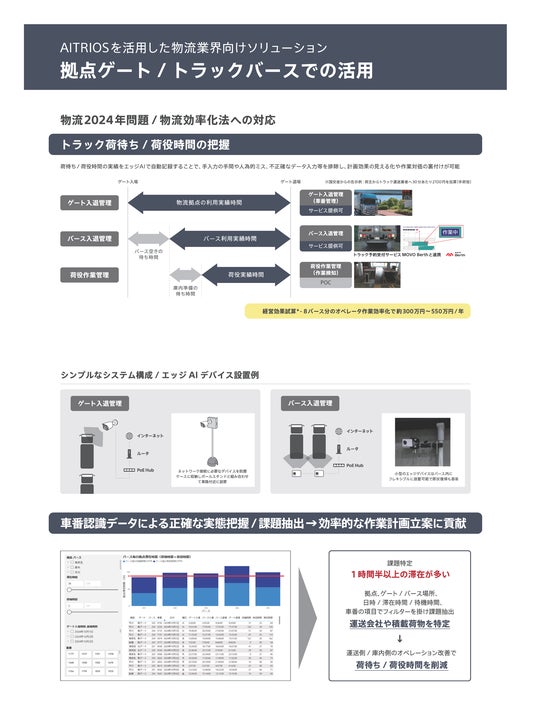 AITRIOSが提供する、AI処理機能を有するインテリジェントビジョンセンサー搭載の小型カメラ(エッジデバイス)を活用した物流DXの事例をパネル展示します。物流業界の現場において
