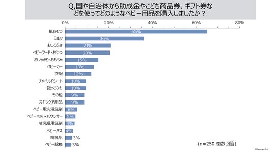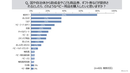 3.今後国や自治体から助成金やギフト券などが提供されるなら、購入したいのは「紙おむつ」80%
