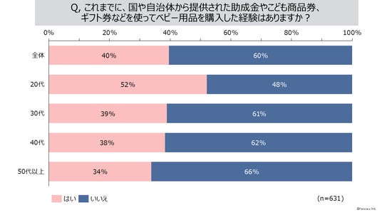 - これまでに国や自治体から提供された助成金やギフト券などでベビー用品を購入した経験がある40%- 購入頻度の高い消耗品の購入に利用