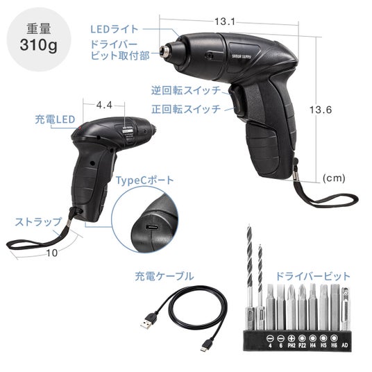 電動ドライバー USB Type-C 充電式 コンパクト ビット10種類 軽量 310g LEDライト付き ドリルドライバー 穴あけ 家具組立て コードレス 小型 ブラック