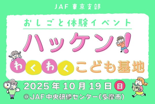 一般社団法人 日本自動車連盟(JAF)東京支部(支部長 加藤和夫)は、10月19日(日)にJAF中央研修センター(多摩市永山)で、小学生とその保護者を対象にした「おしごと体験イベント ハッケン!わくわくこども基地」を開催します。