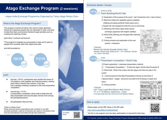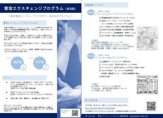 東京愛宕ロータリークラブ(所在地:東京都港区、会長:島津秀隆)は、2025年10月18日(土)および11月15日(土)の2日間にわたり、日印を中心とするアジアの若者の文化交流を目的とした「愛宕エクスチェンジプログラム」を開催します。非営利活動法人ZESDA(代表理事:桜庭大輔、所在地:東京都中央区、以下「NPO法人ZESDA」)は同プログラムの開催に協力します。