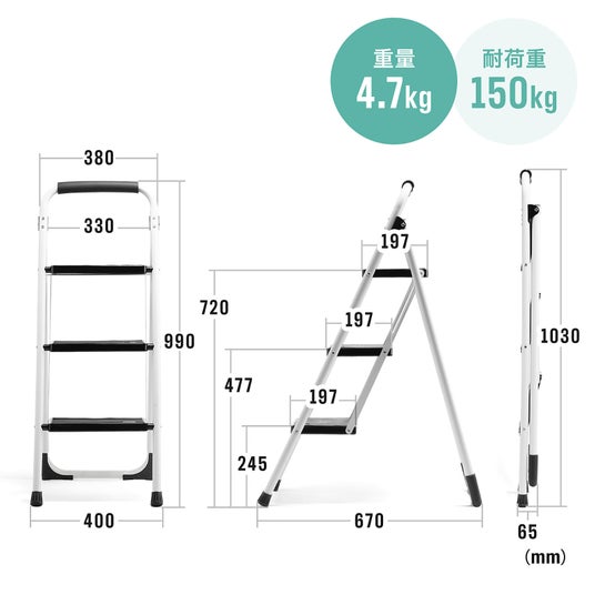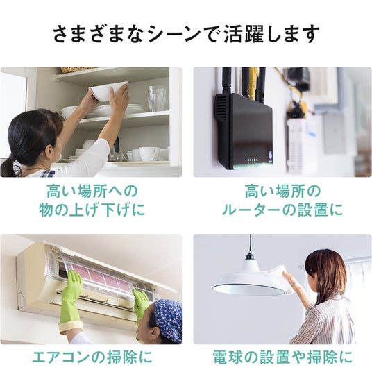 スチール製フレームを採用し、耐荷重は約150kg。頑丈な構造で、体格の大きな方でも安心して使用可能です。掃除や収納作業、ちょっとした高所作業まで、幅広く対応できる頼もしさがあります。