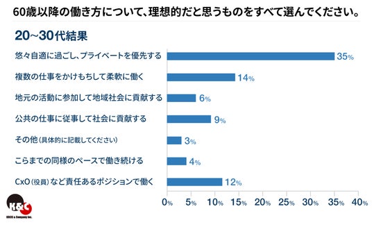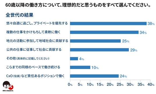 また、年代別の回答を見てみると、40代以上に比べて20~30代の「悠々自適に過ごし、プライベートを優先する」回答比率は約3倍となっていました。40代以上では「複数の仕事をかけもちして柔軟に働く」がトップとなっており、転職や部署異動、職種・職種の変化など、キャリアを重ねた先に多様な価値発揮の方法を見出し、未来の働き方の選択肢を広げている様子が明らかになりました。