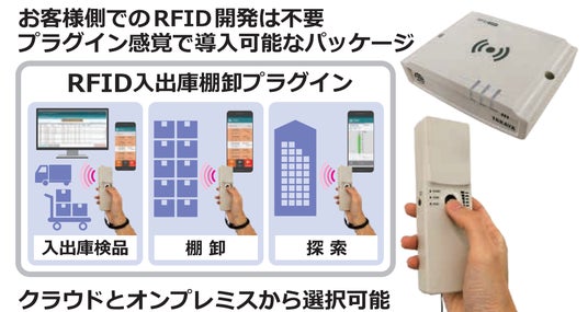据置型RFIDリーダライタとパッケージソフト「入出庫プラグイン」を組み合わせることで、ゲートを通過するだけの入出庫一括検品を実現します。オプションの「シンプル在庫機能」を使用すれば在庫数の把握も可能です。CSVやAPIで上位システムと連携しますので、既存基幹システム等にプラグイン感覚でRFIDを導入できます。