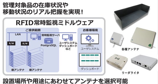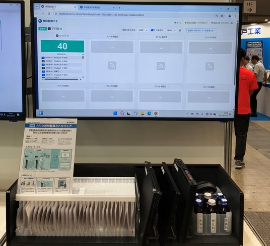 管理対象物のロケーションや在庫状況、移動状況をリアルタイムに監視可能です。1台のリーダライタで棚アンテナを8台まで接続できるので、コストパフォーマンスに優れています。本展示では、かんばん棚やかんばんカード等を対象とし、棚アンテナ及びミドルウェアによる常時監視デモを行います。