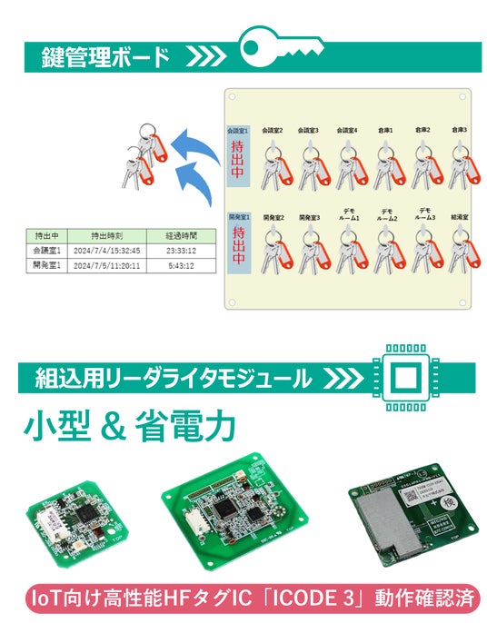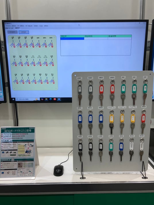 「RFID鍵管理ボード」は、ICタグを鍵に取り付け、専用ボードを設置するだけで導入可能。現状の運用を変えることなく、鍵の持出時刻や持出後の経過時間を正確に記録できます。