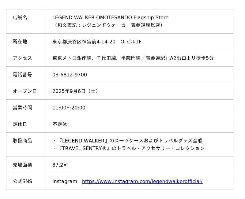 “旅をもっと身近に。”をパーパスに掲げ、スーツケースをはじめとした旅用品を企画・販売する総合メーカー、株式会社ティーアンドエス(本社:埼玉県越谷市、代表取締役:斉 真希、以下当社)は、主力トラベルブランドである『LEGEND WALKER(レジェンドウォーカー)』について、ブランド初となる旗艦店『LEGEND WALKER OMOTESANDO Flagship Store』を2025年9月6日(土)、東京・表参道にオープンします。