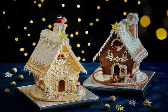 クッキーでつくる高さ約30cmのお菓子の家「ヘクセンハウス」。優しい甘さのバニラと、ほんのりスパイスを効かせたチョコレート、2種類のフレーバーをご用意いたします。家の周りには、雪だるまやクリスマスツリーのほか、ソリを引くトナカイや煙突につかえてしまったサンタクロースなど、フレーバーによって異なるデコレーションを施します。屋根に積もった雪やつらら、壁の細部にまでこだわりを込めた、世界の製菓大会で優勝・受賞者を輩出し続けているペストリーチームの技術が光る精緻なスイーツです。クリスマスのデコレーションとしてお楽しみいただいた後は、そのままお召し上がりいただけます。
