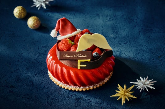 サンタクロースをモチーフにした鮮やかな赤色が目を引くストロベリームースケーキ。香ばしいピスタチオのクリームや甘酸っぱいストロベリージュレをストロベリームースで包み込み、表面を真っ赤で艶やかなチョコレートでコーティングします。トップにはフレッシュないちご、ラズベリー、ブルーベリーをたっぷりとあしらい、さらにサンタクロースの帽子と白いひげ、ベルトをかたどったチョコレートを添えます。遊び心のあるデザインでありながら、香り高いピスタチオの風味とベリーの爽やかな酸味のバランスが絶妙な洗練された味わいです。