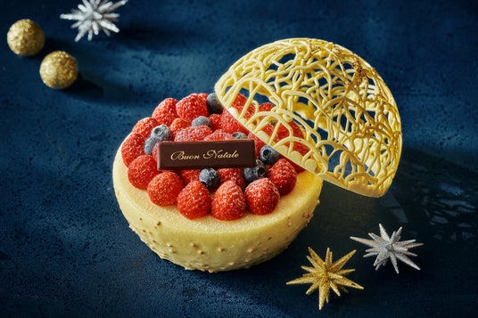 昨年ご好評をいただいたオーナメントボールからインスピレーションを得た球体型のケーキを、今年は爽やかな柚子と甘酸っぱいいちごのフレーバーでご用意いたします。柚子のムースやストロベリージュレ、ストロベリークリーム、バニラ生地を重ね、ナッツを混ぜ込んだ柚子のチョコレートでコーティングします。トップにストロベリー、ラズベリー、ブルーベリーをデコレーションし、最後にレースのように繊細で美しいチョコレート細工をあしらいます。
