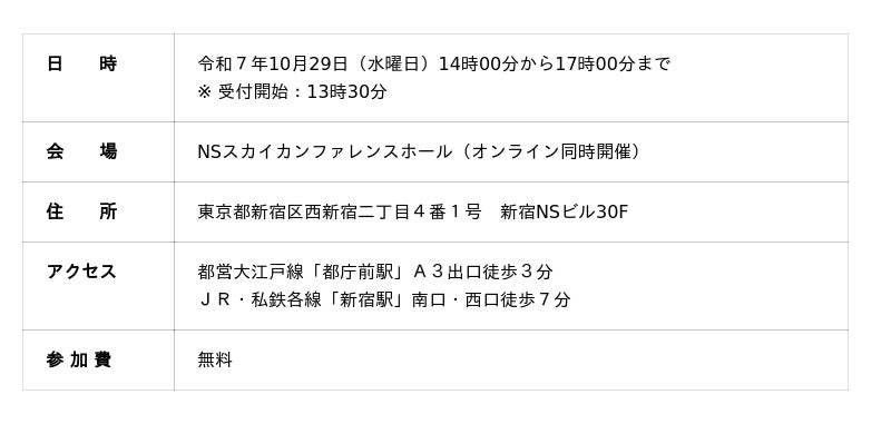 このたび、都内の中小企業や都民の皆様などを対象に、企業がGXに取り組むメリットやその進め方、中小企業の脱炭素化に向けた具体的な取組事例等を紹介する「第1回GX普及啓発シンポジウム2025」を以下のとおり開催します。奮ってご参加ください。