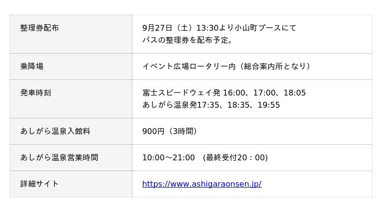 ・27日(土)夕刻に運行するキャンプや車中泊で場内宿泊の皆様にオススメの『あしがら温泉シャトルバス』や、ご年輩やお子様連れのお客様などに『ウェルキャブ』・『ケアシャトル』を無料運行!ご家族皆さまでお越しください!