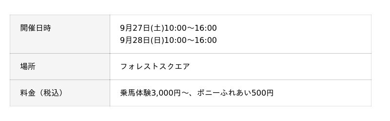フォレストスクエアでは今回もフォレストホースパーク(乗馬体験)を開催いたします。