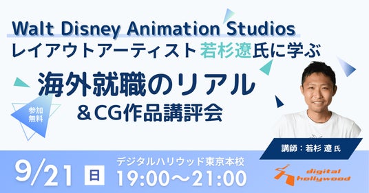 IT関連及びデジタルコンテンツの人材育成スクール[デジタルハリウッド] (運営会社:デジタルハリウッド株式会社、本社/本校:東京都千代田区、代表取締役社長兼CEO:春名啓紀、学長:杉山知之)では、世界的スタジオで活躍する現役CGレイアウトアーティスト、若杉遼氏を講師に迎え、海外での働き方や実際の作品制作を学べるイベント『海外就職のリアル&CG作品講評会』を9月21日(日)に開催します。