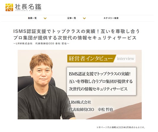 情報セキュリティ教育クラウド「セキュリオ」を提供するLRM株式会社(本社:兵庫県神戸市、代表取締役:幸松哲也)は、代表・幸松哲也が『社長名鑑』のインタビューに応じました。