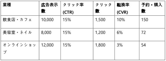 飲食店:広告を見た人のうち5~20%が予約 → 来店客数 7倍増、行列ができるほどの盛況 美容室・サロン:広告閲覧者の2~8%がDM予約 → 新規顧客 5倍増加オンラインショップ:広告経由の来訪者の1~4%が購入 → 売上 2.5倍成長
