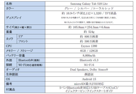 <主な仕様:「Samsung Galaxy Tab S10 Lite」>