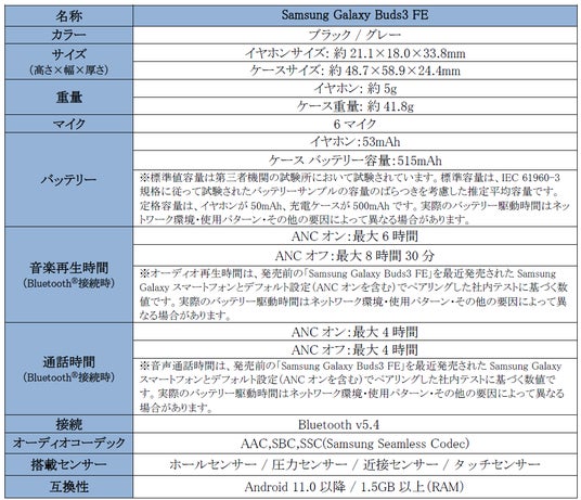 <主な仕様:「Samsung Galaxy Buds3 FE」>