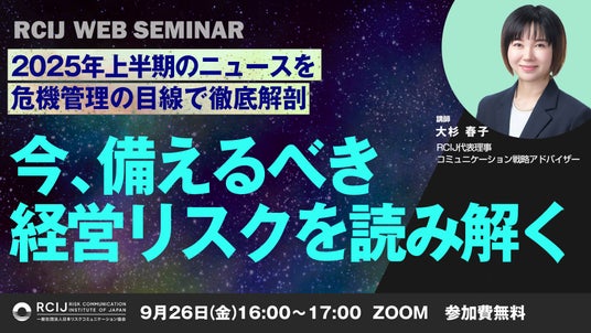 日本で唯一、コミュニケーション戦略におけるリスク管理に特化したカリキュラムを展開する一般社団法人 日本リスクコミュニケーション協会(略称:RCIJ、代表理事:大杉春子)は、企業向けオンラインイベント『2025年上半期ニュースレビュー(炎上・不祥事編)ー今、備えるべき経営リスクを読み解く』を9月26日(金)16:00~17:00に開催いたします。