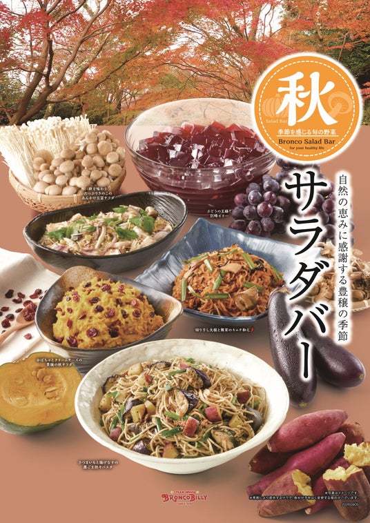 暦の上では秋に入りましたが、今年は残暑が長引き、秋のおとずれはゆっくりだと気象庁の発表にもあります。“食を通じてお客様を幸せにしたい”という思いを大切にしているブロンコビリーでは、秋を先取りして旬の食材を存分に楽しんでいただくため、9月5日(金)から期間限定で「秋サラダバー」の提供を開始いたします。今回の期間限定サラダは、旬のかぼちゃ、さつまいも、きのこをふんだんに使用し、味だけではなく見た目にも秋を感じていただけるラインナップに仕上がりました。