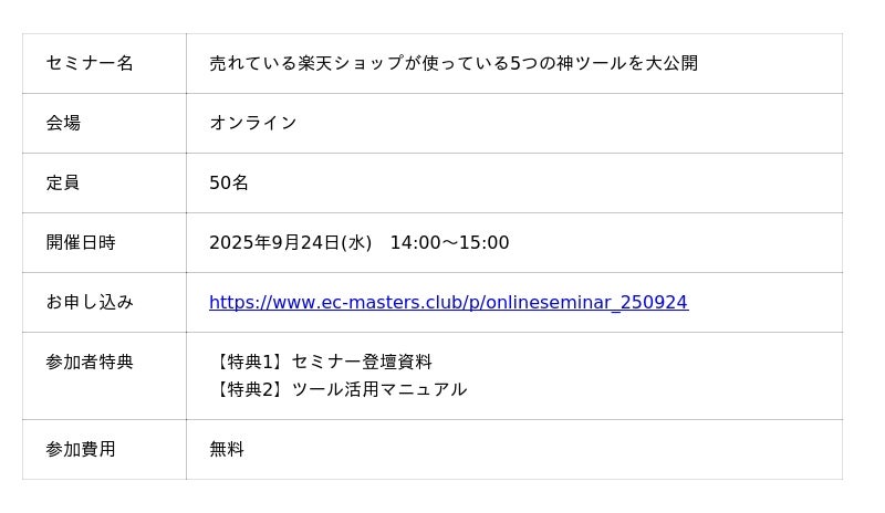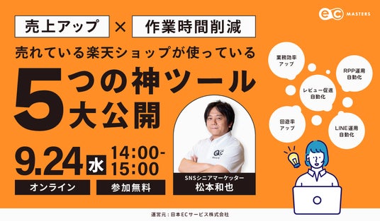 楽天市場などモール出店企業向け会員制サポートサービス『ECマスターズクラブ』を運営する日本ECサービス株式会社(本社:東京都渋谷区 代表取締役:清水将平)は、『売れている楽天ショップが使っている5つの神ツールを大公開』オンラインセミナーを2025年9月24日(水)に開催します。