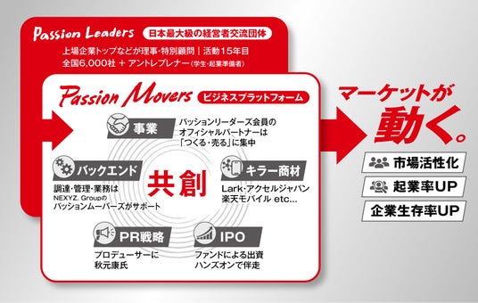 しかも、バックエンド機能を提供する新会社は、親会社である東証上場のNEXYZ.Groupが上場企業を含む経営者・起業家が参加する一般社団法人「パッションリーダーズ」の中核企業であることから、同団体の理事・特別顧問・会員企業が持つあらゆるリソース(人・商材・資金等)を組み合わせることができます。それにより、大手企業の市場レベルに参入・競争できます。