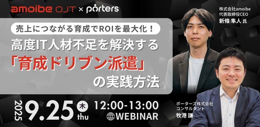 人材ビジネス向けマッチングシステムを提供するポーターズ株式会社(東京証券取引所グロース. 証券コード5126、東京都港区、代表 西森 康二)は、株式会社amoibeと共同で『売上につながる育成でROIを最大化!高度IT人材不足を解決する「育成ドリブン派遣」の実践方法』と題した無料セミナーを2025年9月25日(木)12:00~オンラインで開催いたします。