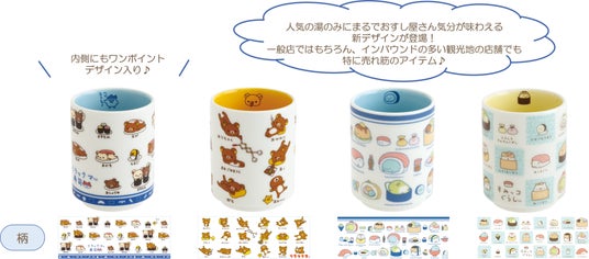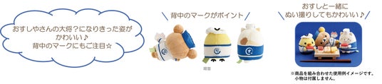 おすしを食べるときにぴったりなおすし皿や湯のみ、しょうゆさし、しょうゆ皿などの食器類から、キャラクターたちがおすしやおすし屋さんの大将になりきったかわいいぬいぐるみ、割りばしみたいなボールペンなどの商品が登場し、インバウンド需要にもぴったりなアイテムです。