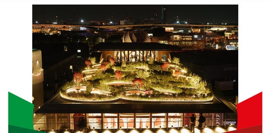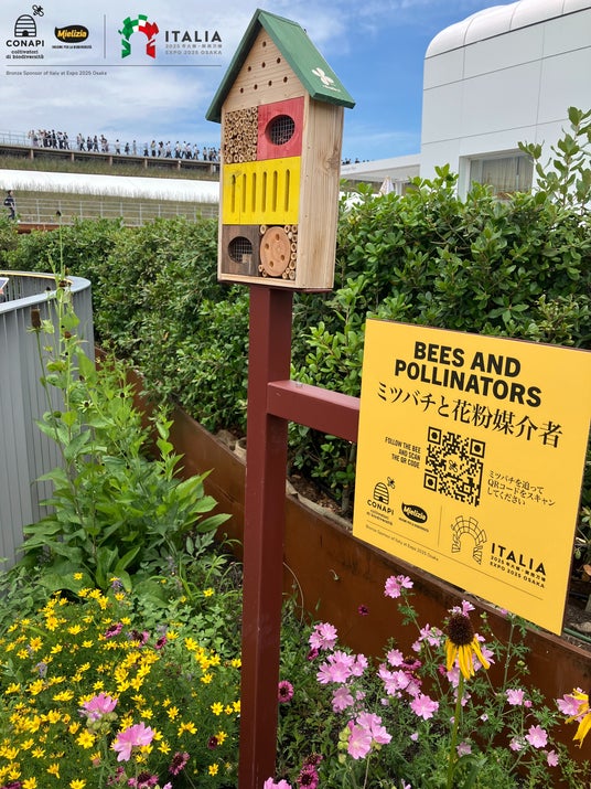 EXPO大阪イタリアパビリオン屋上のガーデン。CONAPI社が設置した、ミツバチの巣箱、ビーホテル*をご覧いただけます(*木と葦で作られた小さな家。単独行動をするミツバチの為のシェルターです。)