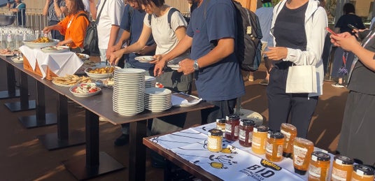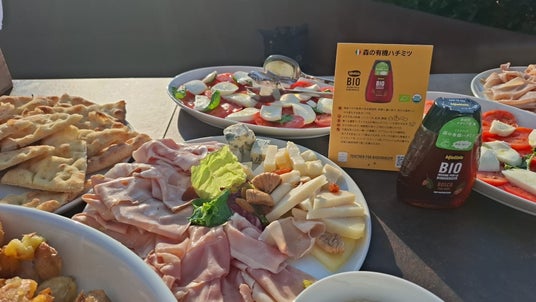 セミナー後は、イタリアパビリオン3FのレストランEATALY様のテラスで、ゲストへイタリア料理が振舞われ、Mieliziaのハチミツの食べ比べを楽しんで頂きました。