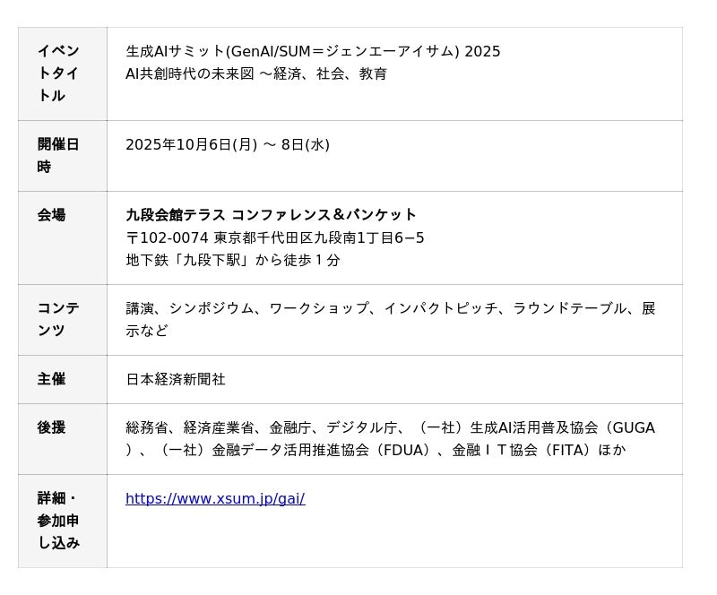 「生成AIサミット(GenAI/SUM)2025」は、日本経済新聞社が主催する生成AI時代の未来像を探る総合フォーラムです。経済・社会・教育をテーマに、国内外の専門家やスタートアップが参加し、シンポジウムやワークショップ、展示、参加者交流などを実施。社会課題解決を目指すスタートアップのピッチコンテスト「インパクトピッチ」も併催されます。