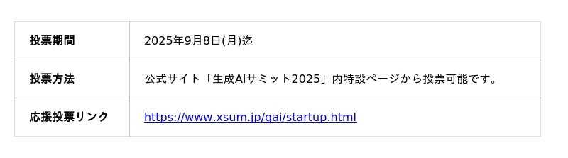 モバイルアプリ開発及びAIサービスの開発を行う株式会社アンドエーアイ(本社:東京都港区、代表取締役社長:西 真央、以下:当社)は、この度、日本経済新聞社が主催する「生成AIサミット(GenAI/SUM)2025」にて開催される、国内外の有力スタートアップによるピッチコンテスト「インパクトピッチ」の一次審査を通過し、有望スタートアップ企業の一社として選出されました。そのため、当社はファイナリスト選出に向けた応援投票の対象企業となり、8月27日より投票が開始されています。