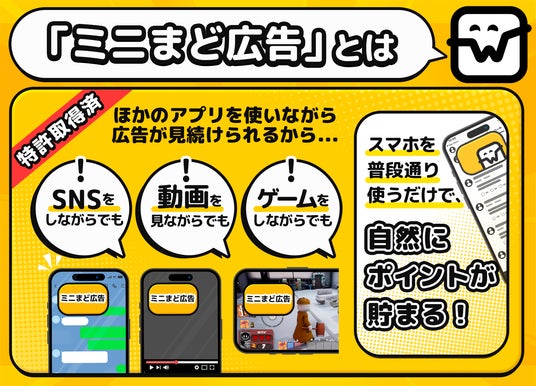 そのため、動画視聴やゲームプレイなど、普段のスマホ利用中でもWickの広告を再生することができます。ユーザーはスマホを使いながらミニまど広告を流すだけで、コンテンツ購入に使えるWickポイントを効率的に貯めることとができる仕組みとなっています。