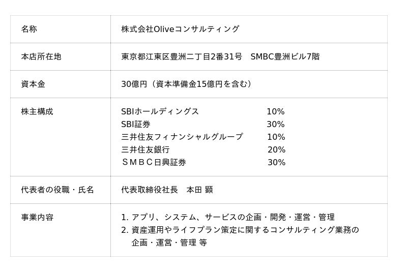 SBIホールディングス株式会社(代表取締役会長兼社長:北尾 吉孝、以下、「SBIホールディングス」、当社グループを総称して「SBIグループ」)、株式会社SBI証券(代表取締役社長:高村 正人、以下、「SBI証券」)と株式会社三井住友フィナンシャルグループ(執行役社長グループ CEO:中島 達、以下、「三井住友フィナンシャルグループ」、当社グループを総称して「SMBCグループ」)、株式会社三井住友銀行(頭取CEO:福留 朗裕、以下、「三井住友銀行」)、SMBC日興証券株式会社(取締役社長CEO(代表取締役):吉岡 秀二、以下、「SMBC日興証券」)は、2025年6月16日のプレスリリースにて、関係当局による認可等を前提に、新共同サービスの企画・提供を行う準備会社を設立する旨公表しておりますが、今般、株式会社Oliveコンサルティング(代表取締役社長:本田 顕、以下、「Oliveコンサルティング」)の設立が完了しましたのでお知らせいたします。